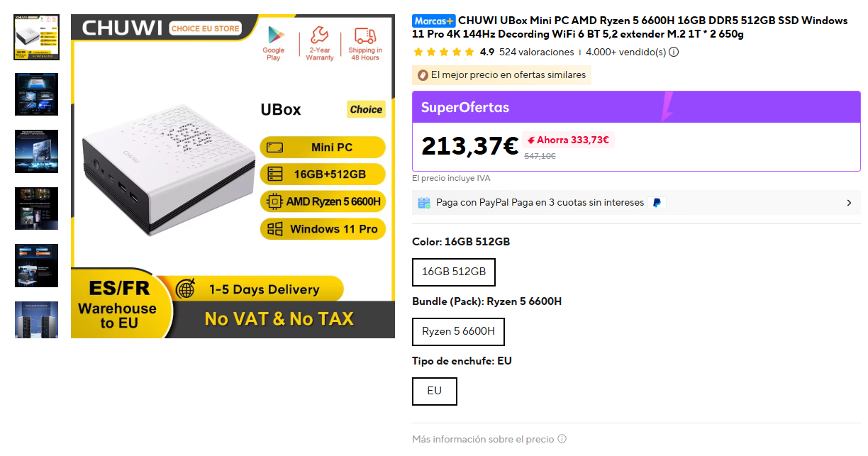 CHUWI UBox Mini PC AMD Ryzen 5 6600H 16GB DDR5 512GB SSD Windows 11 Pro 4K 144Hz Decording WiFi 6 BT 5,2 extender M.2 1T * 2 650g